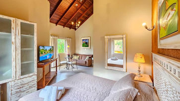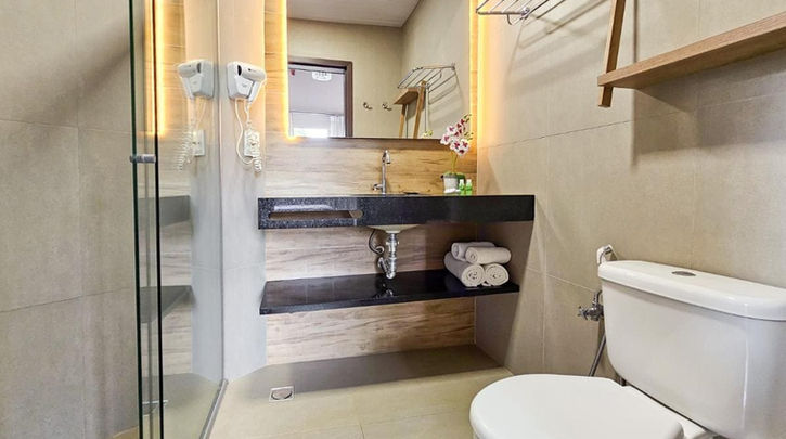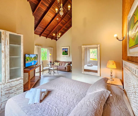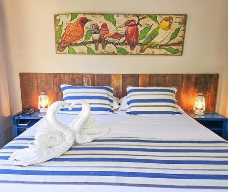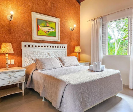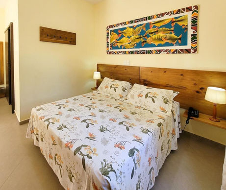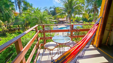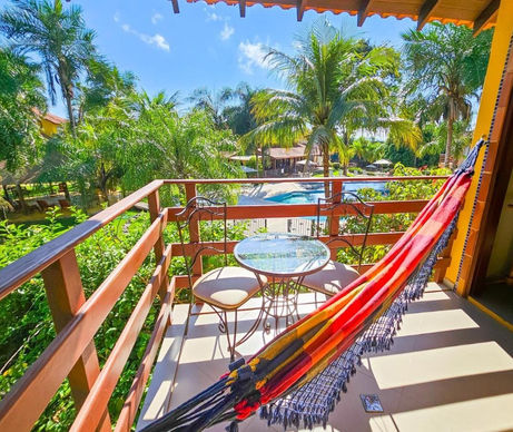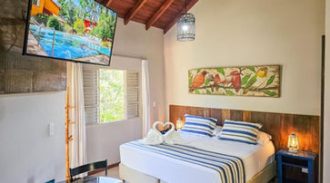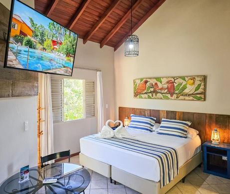 Os quartos da Águas de Bonito são bem decorados, equipados com ar-condicionado, TV, Wi-Fi, banheiro privativo e varanda com rede — muitos com vista para o jardim ou para a piscina. Essa configuração proporciona conforto, tranquilidade e conexão com o ambiente ao redor, ideal para relaxar após um dia de aventuras.